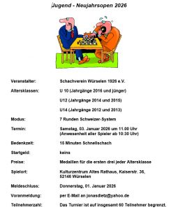 Herbst Open 2025 DWZ Turnier des Schachverein Würselen 1926 e. V.Samstag, 18.10.20253 Runden mit DWZ-AuswertungKulturzentrum Altes Rathaus, Kaiserstr. 36, 52146 Würselen Einteilung in 4er Gruppen